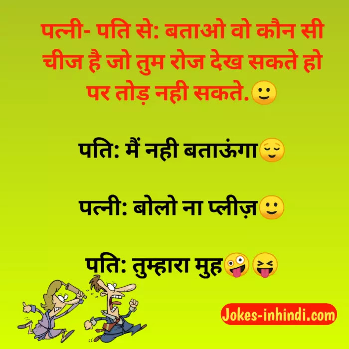 पत्नी- पति🧒🏻 से: बताओ वो कौन सी🙂 चीज है जो तुम रोज देख🙂 सकते हो पर तोड़🤭 नही सकते. पति: मैं नही 😑बताऊंगा पत्नी: बोलो ना 😚प्लीज़ पति: तुम्हारा मुह😎 😂😂🤣🤣🤣