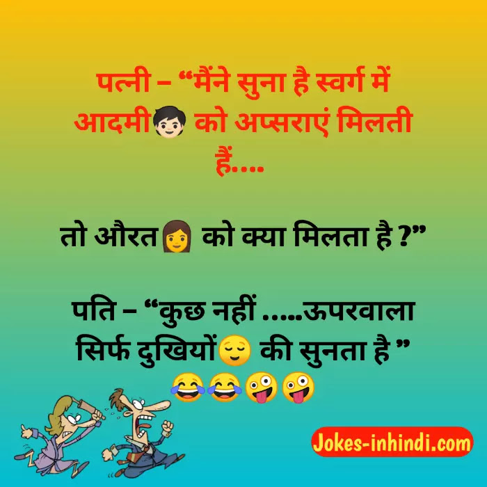 पत्नी 👩– मैंने सुना है स्वर्ग में आदमी 🧒🏻को अप्सराएं 💃मिलती हैं…. तो औरत👩🏻 को क्या मिलता🤔 है ?” पति – कुछ नहीं …..ऊपरवाला सिर्फ दुखियों😌 की सुनता है … 😂😂🤣